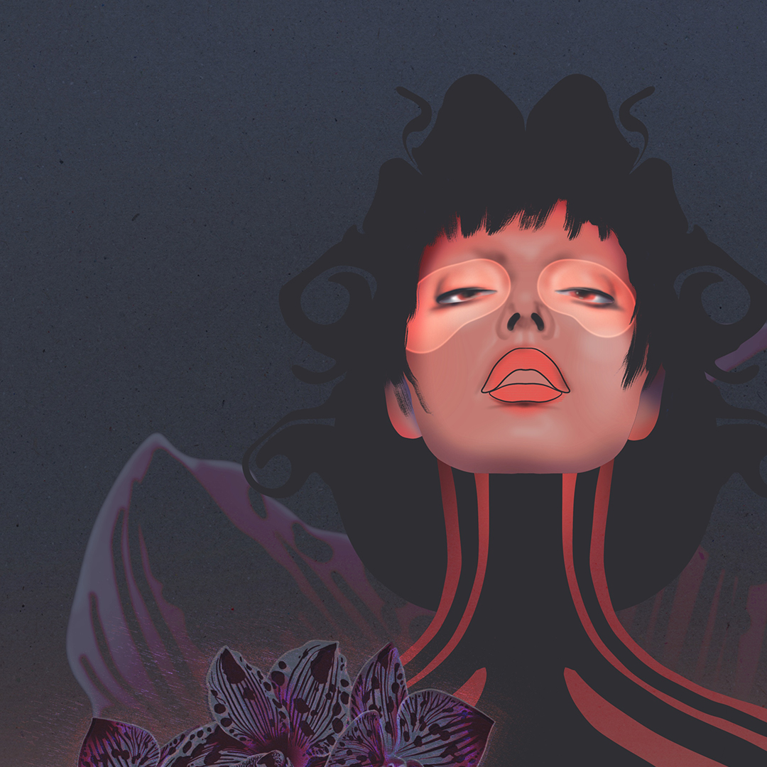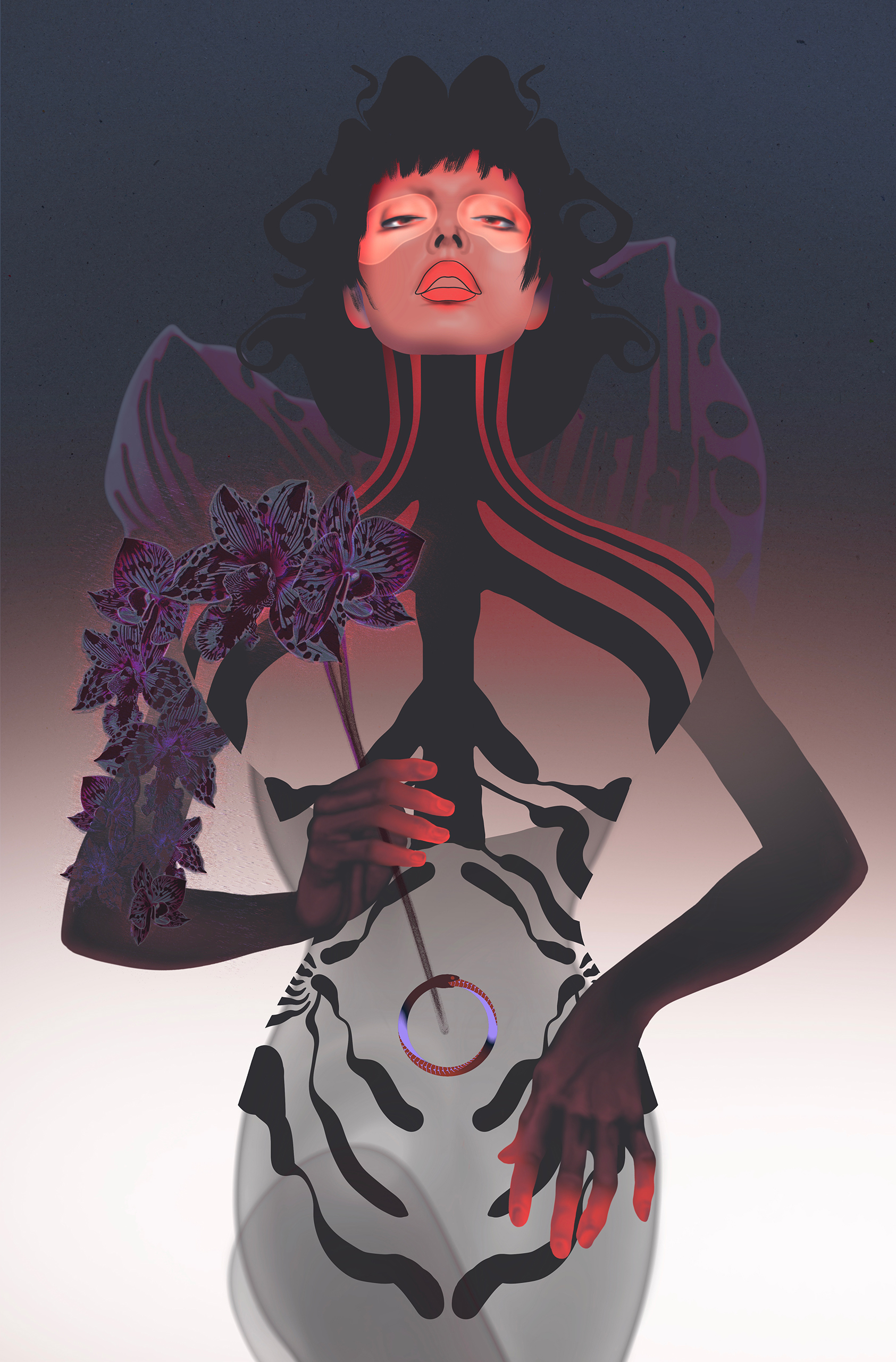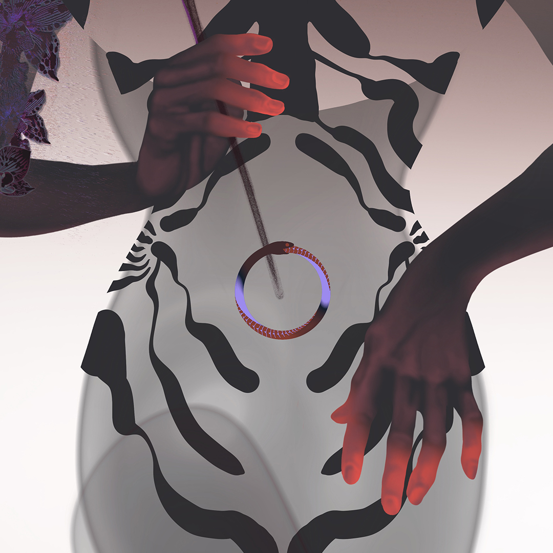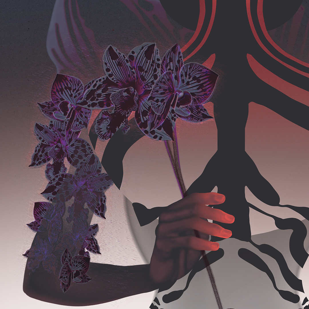 Le sceptre d’orchidées glisse vers son centre. Fleurs de fécondité, elles accompagnent ce mouvement intérieur, cette descente vers le ventre, espace de transformation, de patience, d’écoute.
